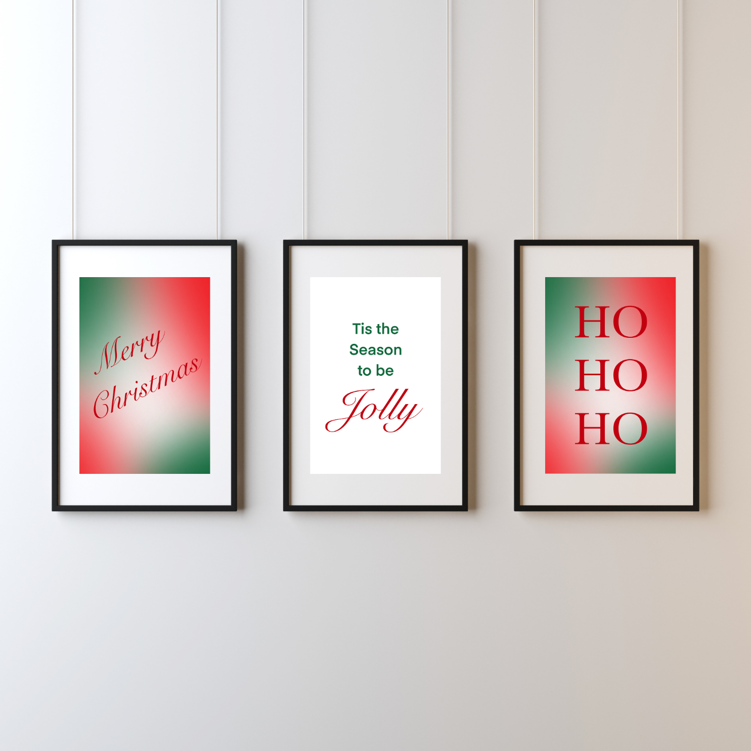Bring cheerful Christmas spirit into your home with this bold and modern “HO HO HO” wall print! Featuring vibrant red typography set against a softly blended red-green gradient background, this print adds a warm and joyful holiday vibe to any room.