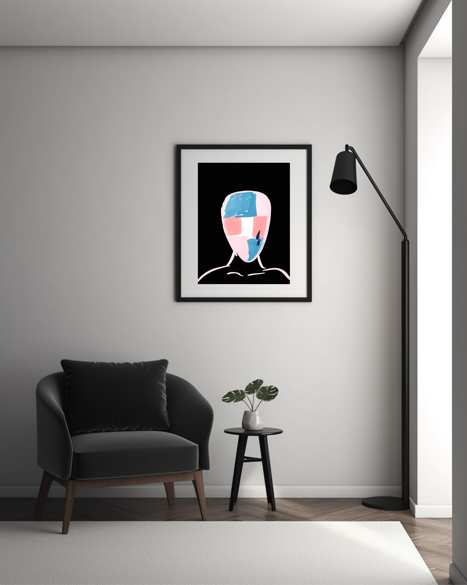 Longing is a contemporary abstract portrait that captures the quiet emotion of introspection through minimalist form and expressive colour. Bold brushstrokes of pink and blue merge in a faceless figure, symbolising vulnerability, emotion, and the complexity of human feeling. The simplicity of the composition allows each hue and shape to speak with quiet strength, making it a striking piece for modern interiors.